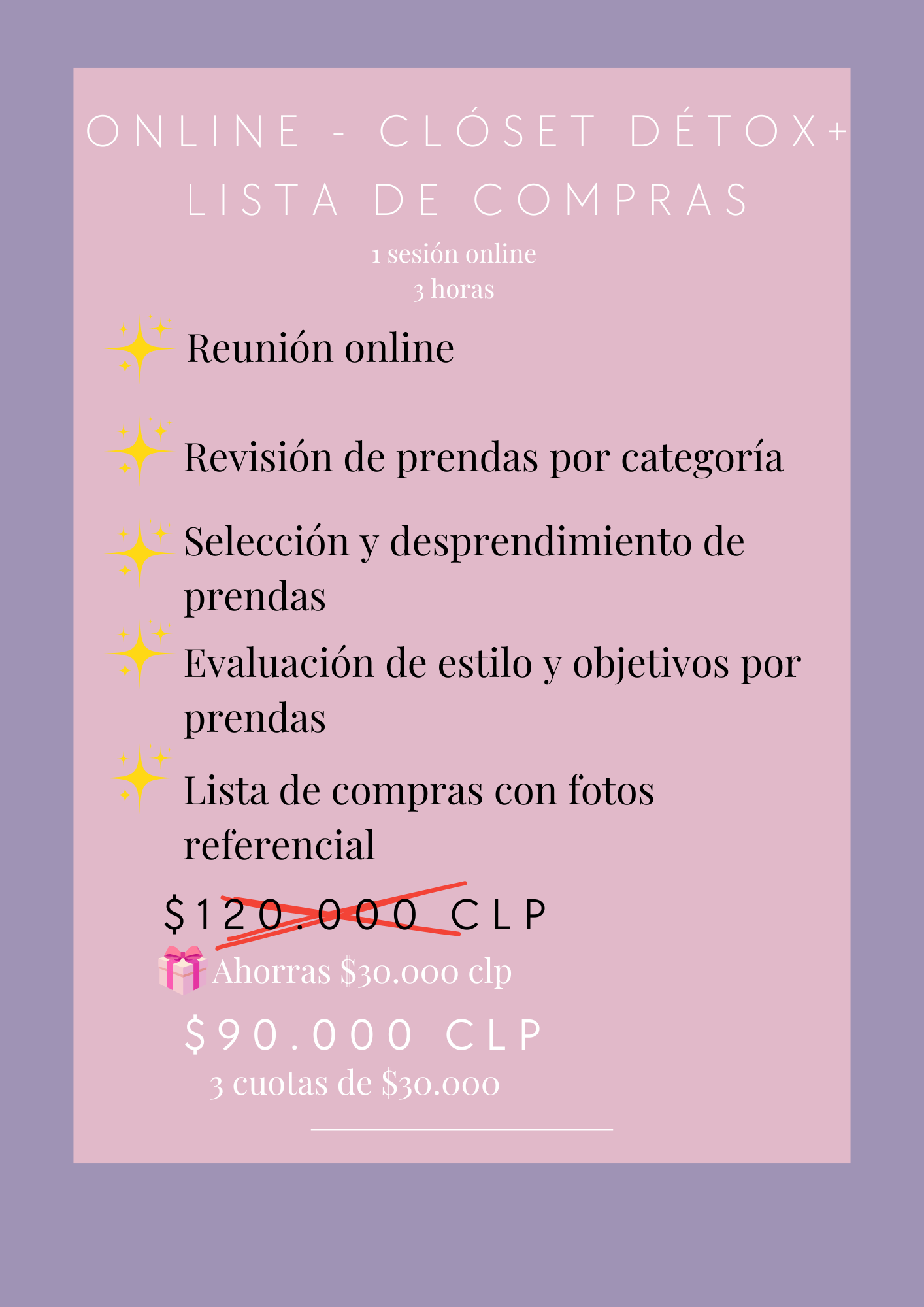 Si ya tienes tu clóset con prendas nuevas y antiguas, pero no sabes cómo combinar, que usar y que no, como organizar el clóset y qué cosas desechar, ahí es cuando entro yo, y te ayudo con un orden de clóset. Durante 3 horas revisaremos detalladamente de manera online que prendas tiendes y cual te hacen falta, para finalizar con una lista de compras con fotos referenciales de que cosas faltan para armar looks deslumbrantes.